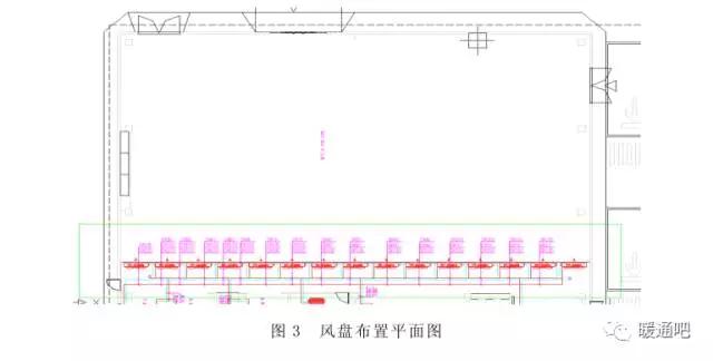 現(xiàn)象二: 某展廳采用臥式暗裝風(fēng)機盤管單側(cè)側(cè)送風(fēng),15 臺 FP-204WA 緊密布置,如圖 3 所示,機組運行后噪音超標(biāo),同樣引起客戶的不滿。
